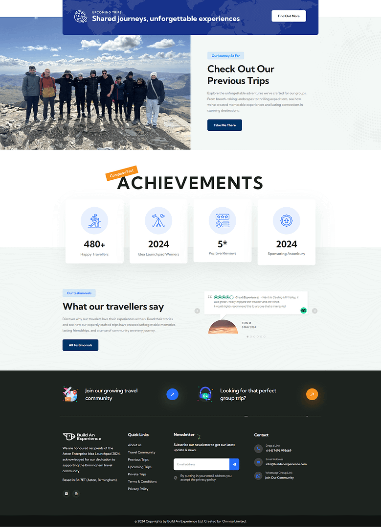 Build An Experience is an award-winning group travel company specializing in personalized group trips across the country, with tailored itineraries, transportation, and a vibrant travel community. While they currently focus on student travel, they are expanding to offer private trips for the executive sector. They also host a growing WhatsApp community for members to share ideas and requests.Omnisa was tasked with creating a high-quality, professional website that captures the spirit of freedom and exploration central to Build An Experience.